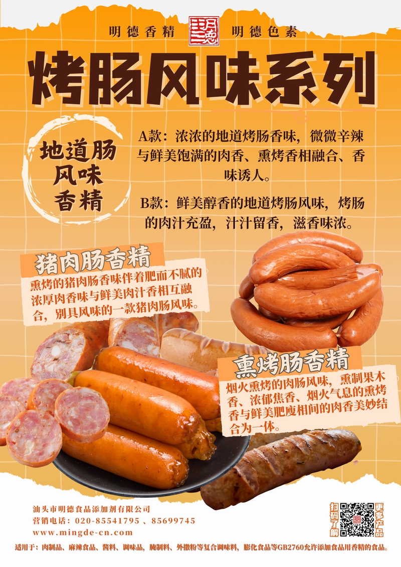 明德烤腸風(fēng)味系列香精 煙熏肉香 層次真實(shí)汕頭市明德食品添加劑有限公司推出的烤腸風(fēng)味系列香精,覆蓋地道腸風(fēng)味香精、豬肉腸香精、熏烤腸香精等多種調(diào)性。產(chǎn)品風(fēng)味真實(shí)、留香穩(wěn)定,適用于肉制品、復(fù)合調(diào)味、腌制與外撒粉等B端工廠,幫助快速打造具有記憶點(diǎn)的烤腸類(lèi)風(fēng)味。